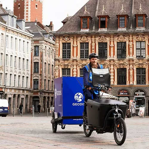 À seulement 3km du centre-ville de Lille, une nouvelle base logistique urbaine de 5 000 m2 a été créée. Les marchandises sont triées sur site puis acheminées par nos équipes de GEODIS vers les particuliers et les commerçants de la ville. Deux tournées quotidiennes de livraison sont organisées à l’aide de véhicules bas carbone (camions et véhicules légers alimentés en biogaz) et de vélos cargo.