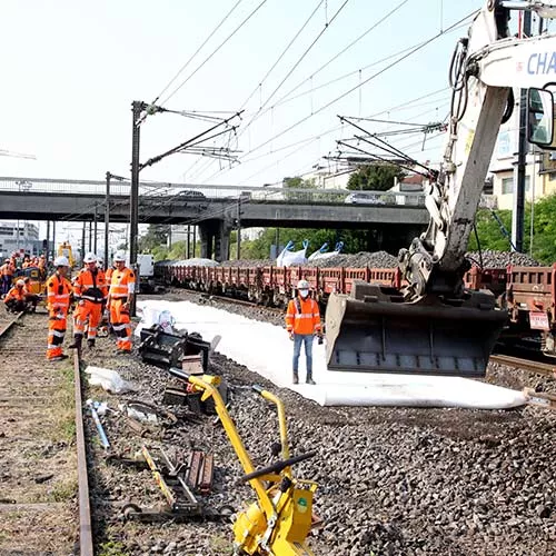 Nous recourons à des méthodes préventives pour maîtriser la croissance de la végétation sur nos voies. Parmi celles-ci, la pose d’un géotextile anti-végétation, placé sous les pistes de cheminement et recouvert de sable, sur les voies de services ou autour de certains équipements. Ils permettent d'éviter l’enracinement des plantes et sont progressivement installés sur l’ensemble du réseau lors des opérations de renouvellement de voies pour les pistes.
